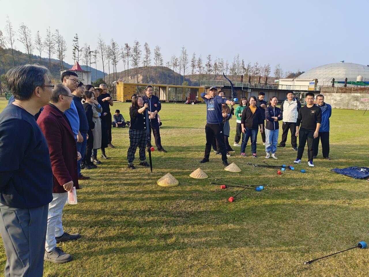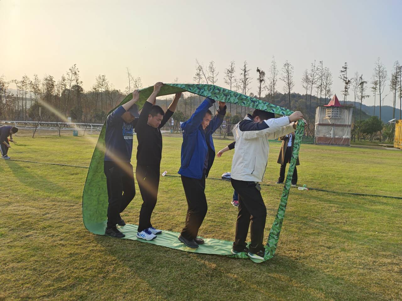 此次工会活动为户外团队素质拓展,全体成员被随机分为四队,在拓展教练的指挥下,采用团队协作和竞技对抗的模式。经过简单预热、舒展筋骨后,各队成员打破腼腆,迅速“破冰”融入集体训练活动中。在欢快与轻松的氛围中,大家先后出色完成了默契百分百、百发百中、车轮滚滚、排兵布阵等一系列拓展训练项目,现场笑声阵阵、喝彩声连连。竞技比拼中,大家集思广益、团结互助,为实现同一个目标共同努力,充分展现了老师们团结、拼搏、积极向上的精神风貌。