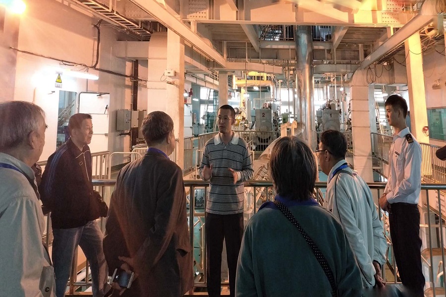 首先赵庆辉同学向来访校友详细地介绍了机舱一楼设备和系统,分别从柴油机的组成相关部件以及二冲程柴油机的工作过程深入浅出地介绍了一楼MAN B&W5S35ME-B9柴油机。同时围绕柴油机,又分别介绍了滑油冷却系统、中央冷却系统、压缩空气系统和消防系统。紧接着,由童守宝同学向各位来宾介绍了机舱二楼相关设备和系统,其中包括集控室的船舶电站,各种遥控系统。最后,丛岩老师耐心详细解答了来宾的问题在整个讲解过程中,来宾们不时地对学校建设道出赞美之词。