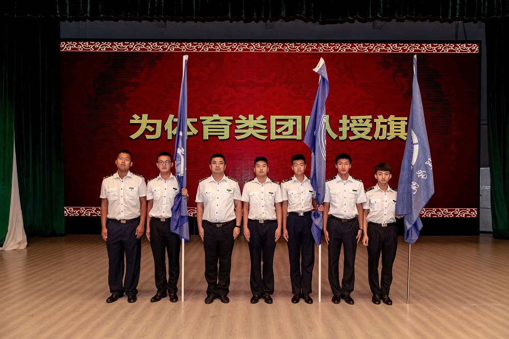 大会第二部分为授旗环节。主持人代表学院宣读寄望书。杜建华为仪仗队新任队长颁发聘书并向新队长授旗,毕鹏杰为游泳队、排球队、篮球队、足球队、轮滑队、跳绳队、拔河队、田径队新任队长颁发聘书并向新队长授旗。