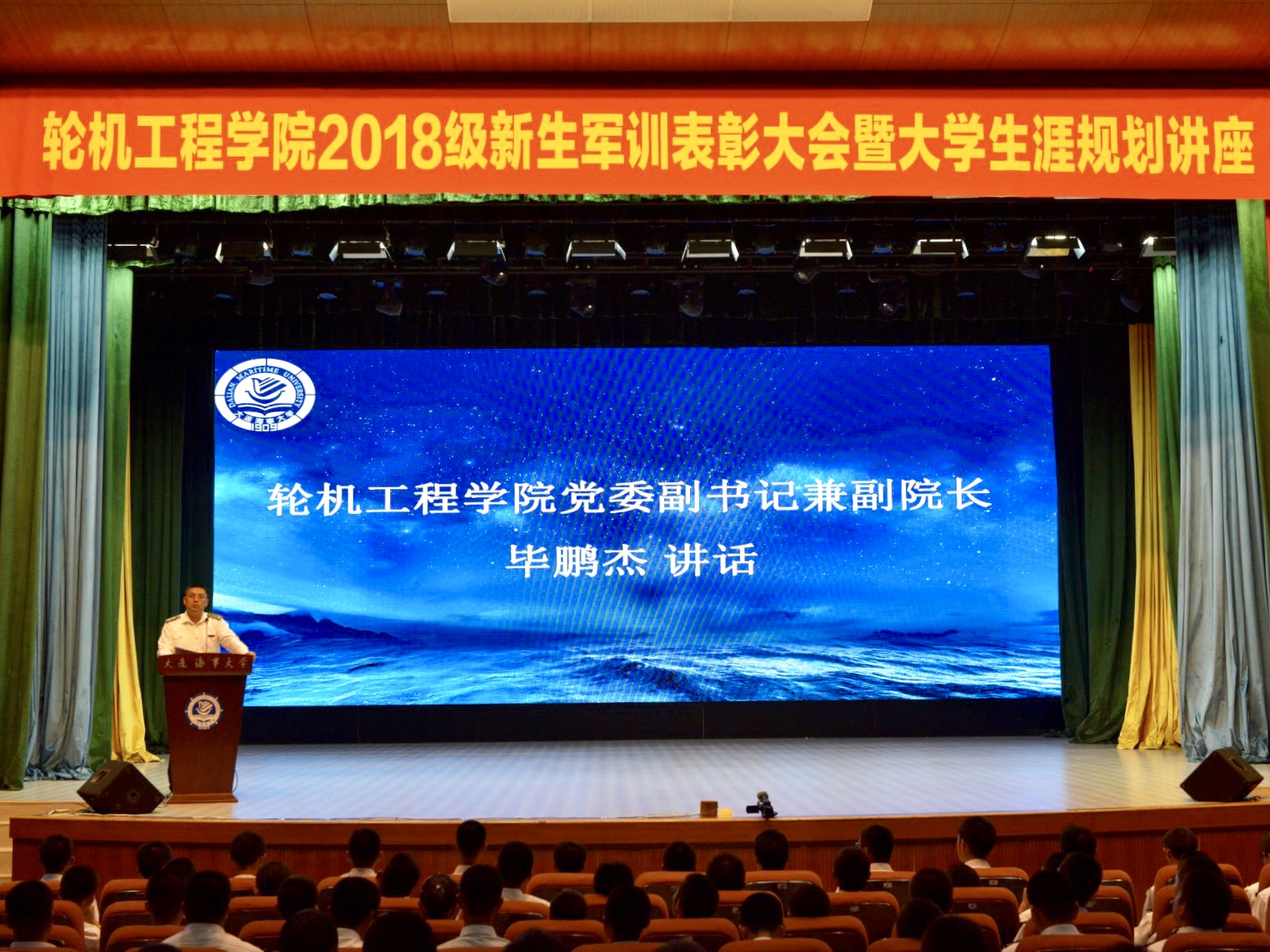 9月28日晚,bat365在线中国官网登录入口2018级新生军训表彰大会暨大学生涯规划讲座在东山礼堂举行。bat365在线中国官网登录入口特聘职业发展与就业指导中心老师林楠,bat365在线中国官网登录入口党委副书记兼副院长毕鹏杰,学院半军事管理大队副大队长程朝阳,学院团委书记路浩以及全体专兼职指导员出席此次大会。大会由学院2018级指导员吕延枫主持。