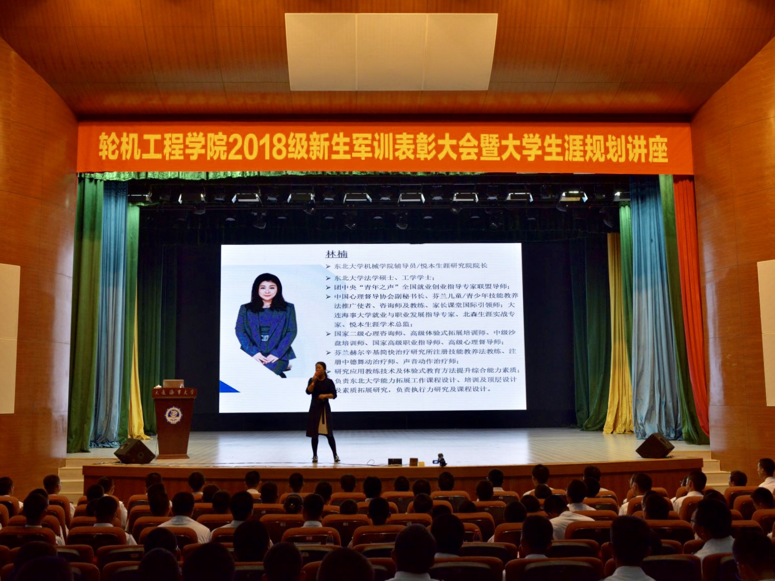 表彰大会结束后,林楠老师为2018级同学做大学生涯规划讲座。教导学生们应在大学初期就明确所学专业的就业方向和就业领域,确定自己的理想,紧跟时代潮流,提升能力,帮助刚步入大学,感到迷茫的学生指出前进的道路。