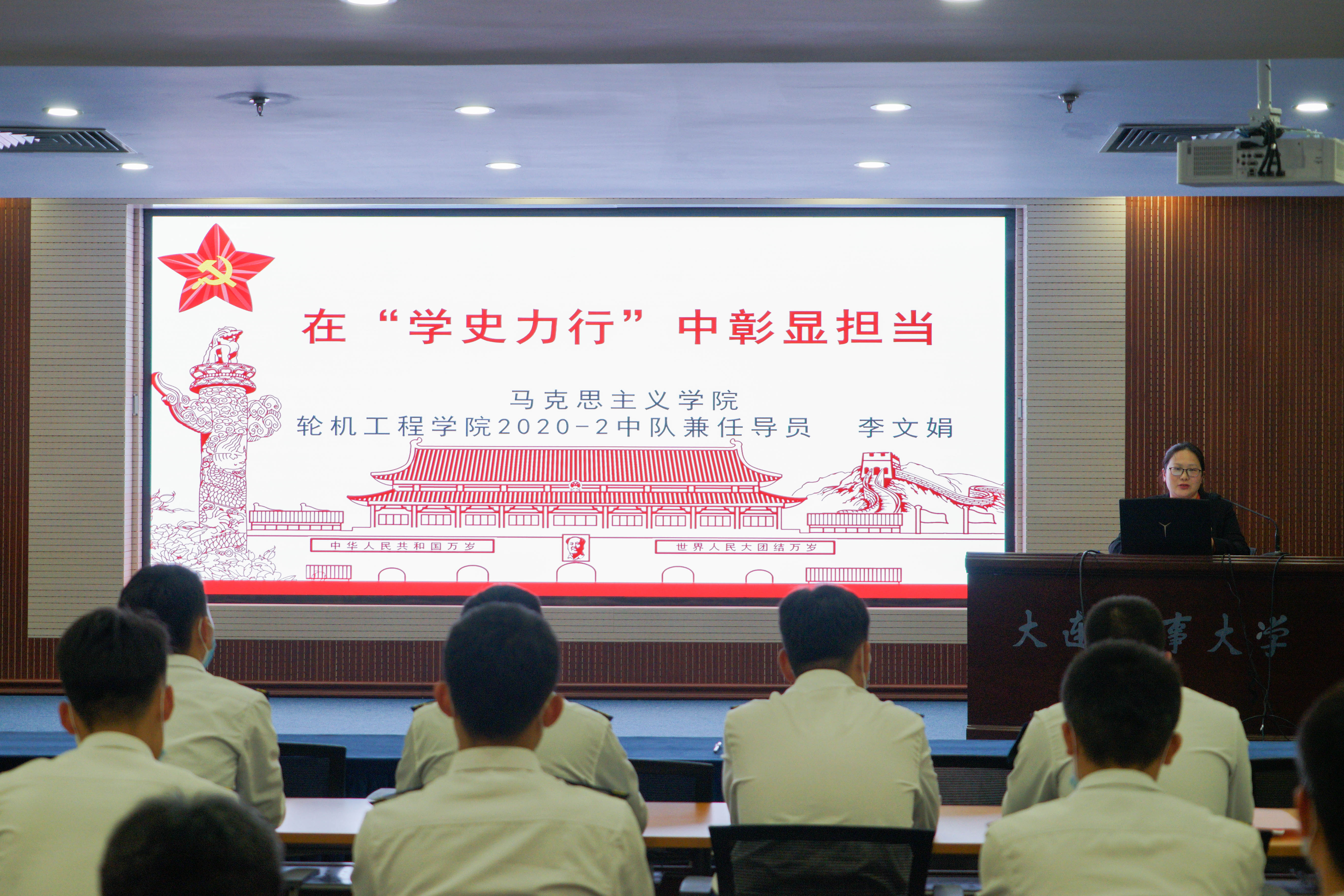 交流会结束后,马克思主义学院教师、bat365在线中国官网登录入口2020-2中队兼职指导员李文娟进行了本次培训班的第一讲——“在‘学史力行’中彰显担当”。李文娟从中国共产党有为人民服务的宗旨,有远大的理想追求,有崇高的使命感,有科学的理论指引,有选贤任能的机制,有严明的纪律,有自我革命的精神,有不断进取学习的良好文化素养八个层面,解释了“中国共产党为什么能”,并希望同学们在代职工作中做到强信念,勇担当,在党史学习教育中继承革命精神,汲取智慧力量,不断提升自我修养,秉持优良作风永不松懈。