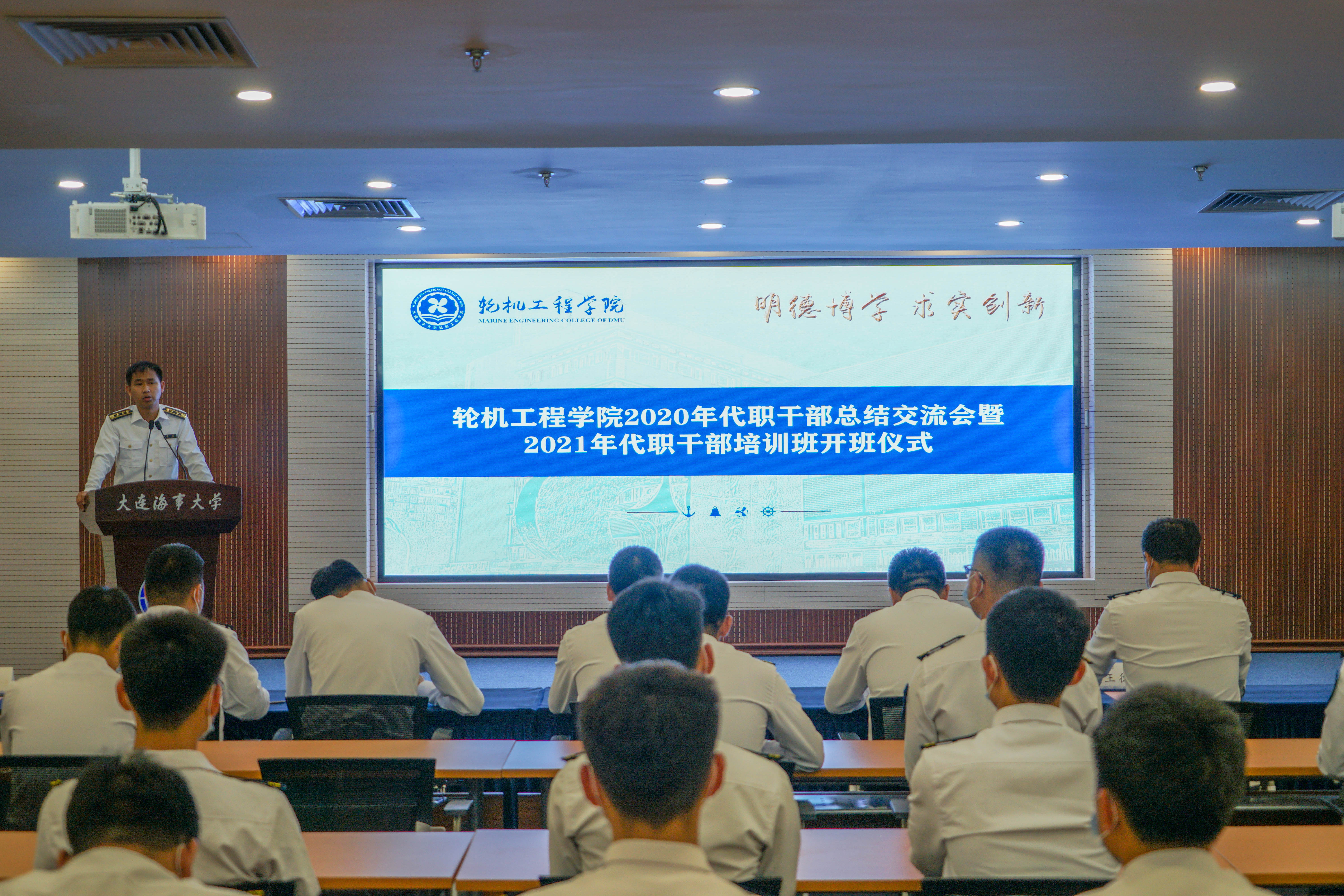 毕鹏杰作总结讲话,在肯定2020 级代职干部在新生的教育管理中发挥重要作用的同时,也对2021级代职干部提出三点希望,一是增强使命意识,希望代职干部能够提高认识,端正态度,让“热爱祖国,热爱海洋,兴我海大,爱我轮机”成为自己及新生一生奋斗的目标;二是增强标杆意识,希望代职干部能够严格要求自己,以身作则,以自己的一举一动,一言一行,影响新生,带动新生;三是增强奉献意识,希望代职干部能够勇奉献,敢担当,以顽强拼搏的毅力和任劳任怨的精神做好代职工作。