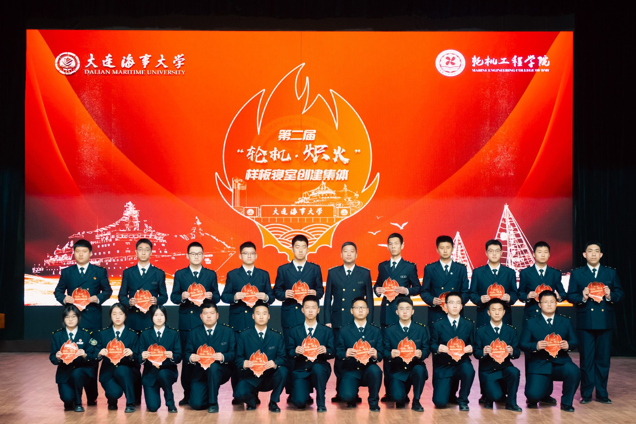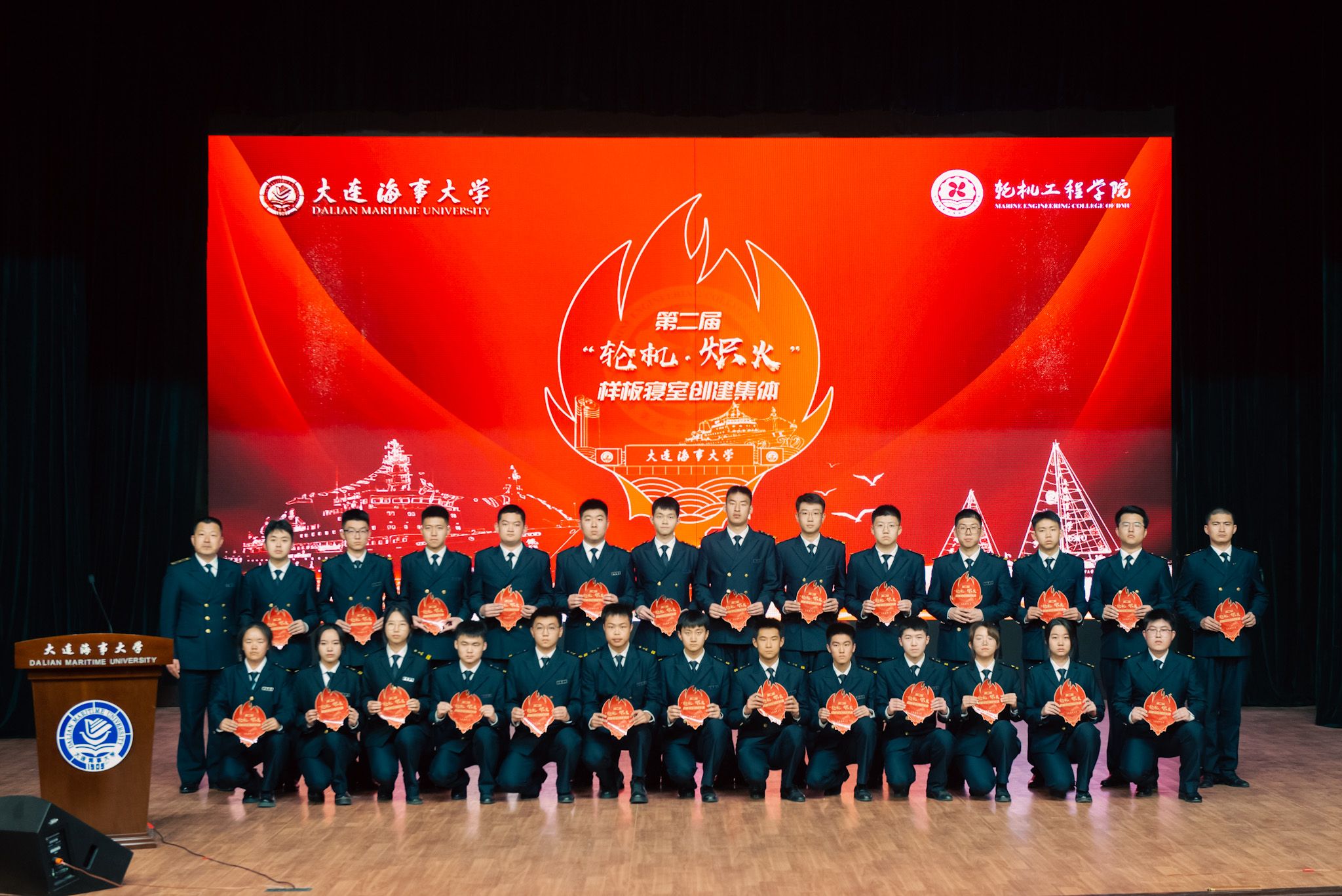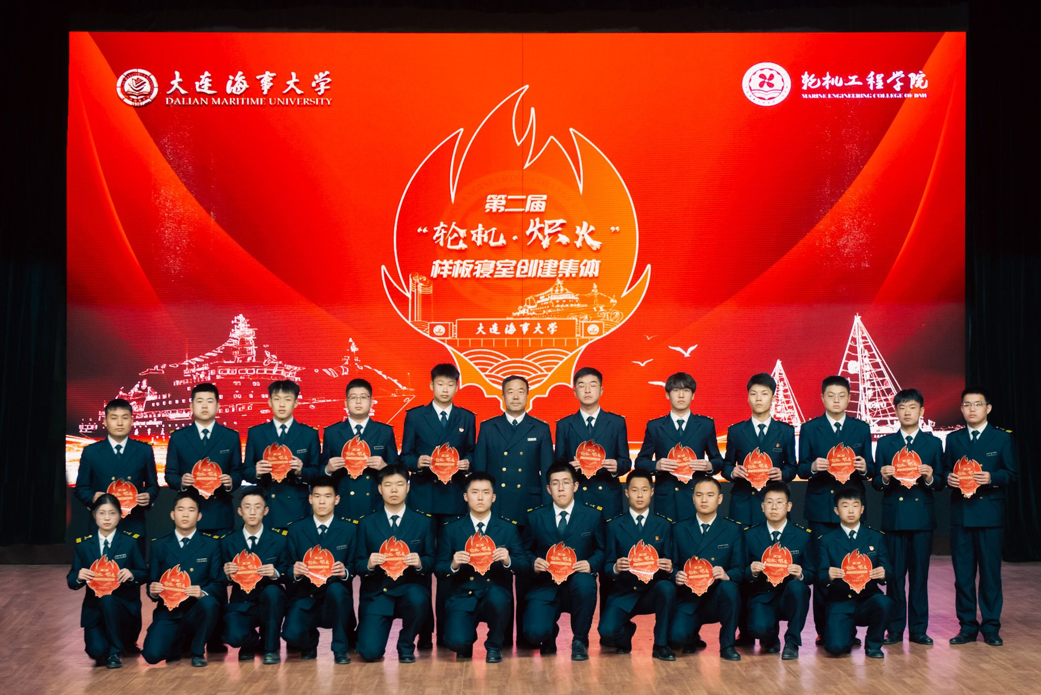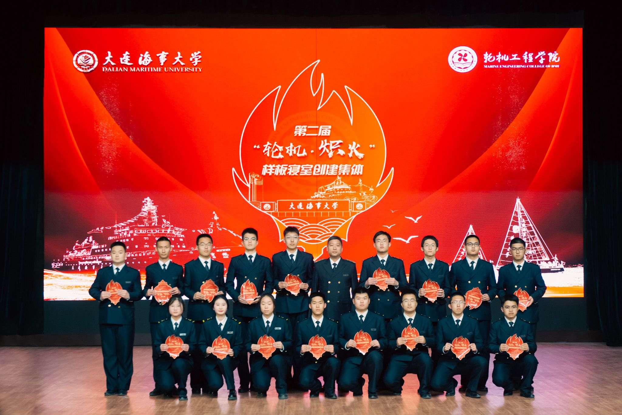 学院半军事管理大队副大队长王德明、陈虎、周浩斐分别为2020-2022级入选学院第二届“轮机·炽火—样板寝室”创建集体颁发创建标识。