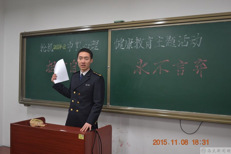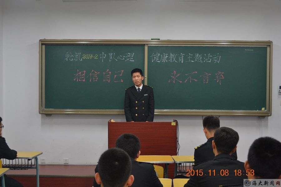 为进一步提高中队学困生的心理素质,提高同学们承受挫折能力,培养积极向上的心态,促进中队形成良好的学习风气。11月8日晚,bat365在线中国官网登录入口轮机2014-2中队在积学楼409教室开展了以“相信自己,永不言弃”为主题的心理健康教育活动。本次活动由存在挂科记录的同学参加,中队指导员陈强主持。