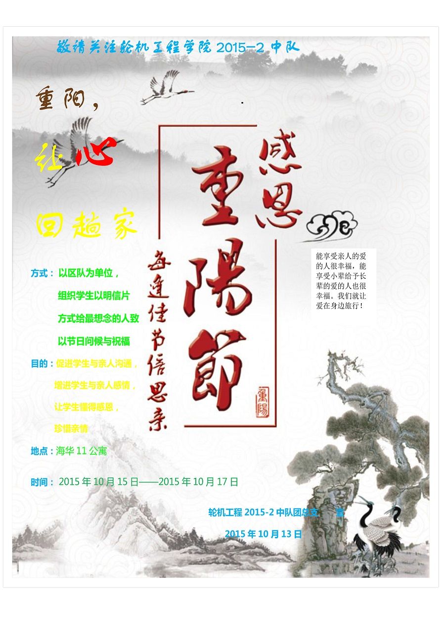 在中国传统佳节重阳节到来之际,为提升学生感恩意识,轮机2015-2中队于10月15日-10月17日组织开展了“重阳,让心回趟家”主题感恩活动。