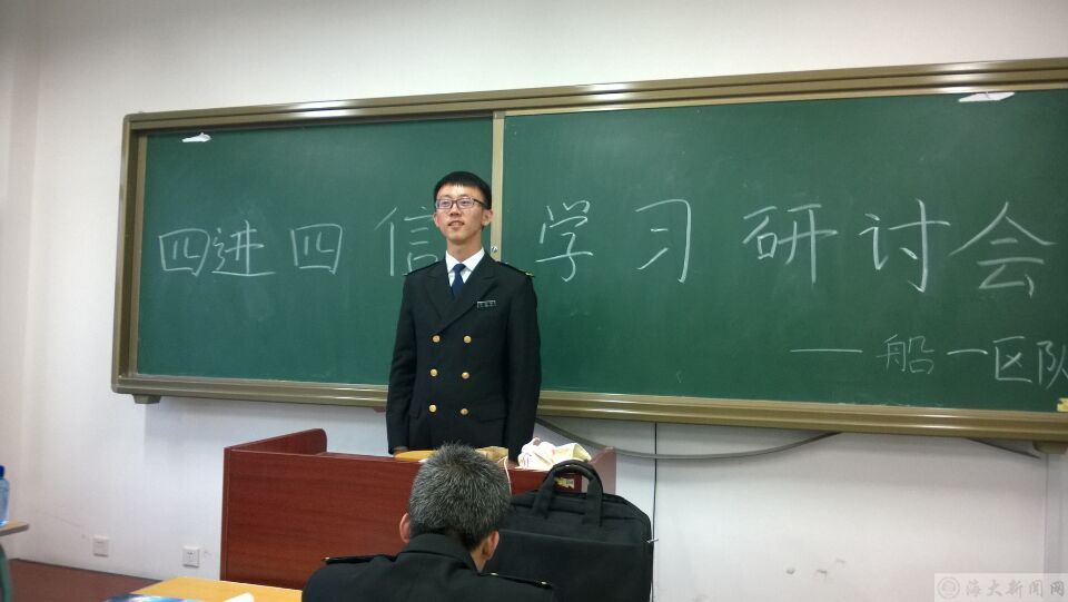 为了积极响应学校关于大学生“四进四信”学习的号召,丰富同学的知识,加强同学们对时事政治的关注,bat365在线中国官网登录入口轮机2014-3中队船1区队于4月22日在积学楼412开展了“四进四信”学习研讨活动。