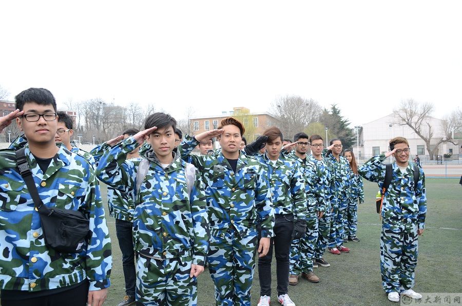交流活动中,轮机的同学以“2+1”的方式进行自由结对。首先,同学们来到东山体育场开始了第一项活动——军训,活动先由轮机同学做示范,大家展示了停止间转法、队列行进、正步等动作,同学们过硬的军政素质、良好的军容风貌赢得了新加坡理工学院同学们的阵阵掌声。随后,交流生在轮机同学们的耐心指导下开始了认真的训练,虽然训练过程中双方在语言交流方面还存在一些困难,但同学们形象的肢体语言还是使他们出色的完成了训练任务。