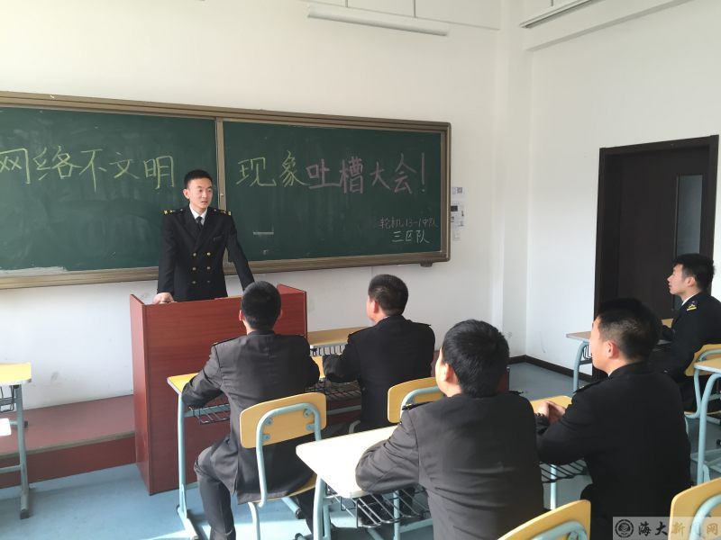 为积极响应共青团中央《清朗网络·青年力量》的倡议,宣传bat365在线中国官网登录入口网络文明志愿行动倡议书,倡导学生建立和谐健康的网络环境,鼓励学生积极健康地使用网络和享受现代文明带来的便捷,按照上级团委下发的活动指导,bat365在线中国官网登录入口轮机2013-1中队3区队举办了 “网络不文明现象吐槽大会” 主题班会。