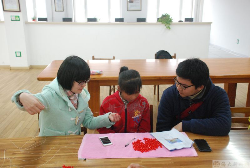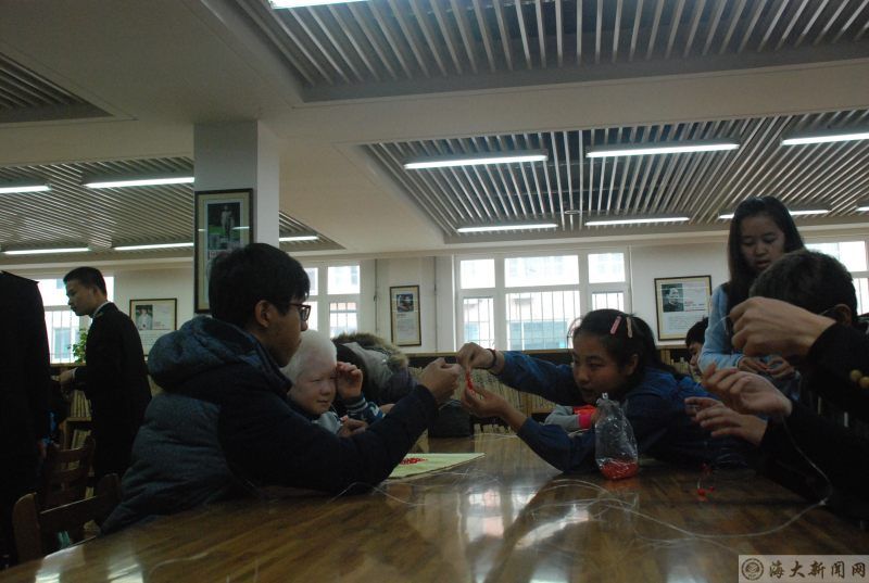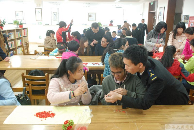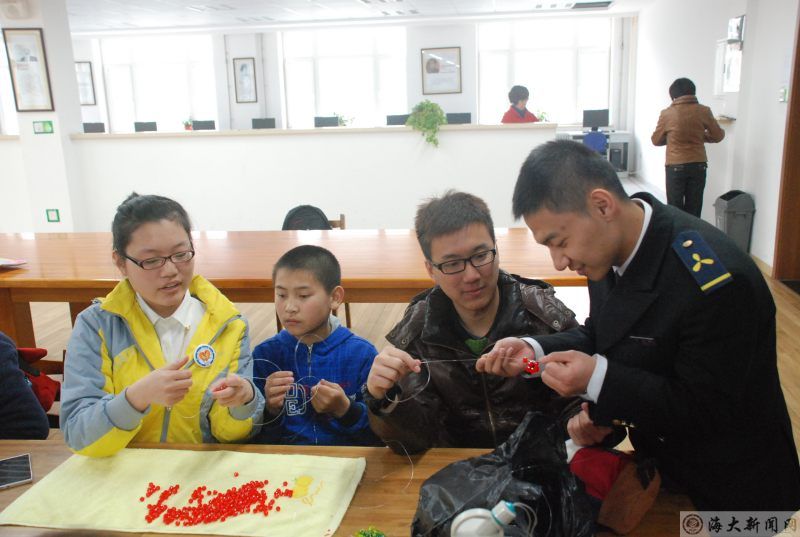 上午9时,在国际教育学院指导员张肃和轮机指导员陈强的带领下,轮机2014-2中队学生代表和新加坡交流生代表来到了大连市盲聋学校。在活动开始之前,同学们先进行了分组。活动开始后,盲聋学校的老师首先给同学们讲解了手工工艺品的制作过程,并拿出一些简单的样品进行展示。随后,在老师们的带领下,同学们和盲聋儿童开始学习制作手工工艺品。尽管与盲聋儿童之间在语言交流上存在障碍,但同学们通过在桌子上用小红珠拼摆字形使得问题迎刃而解,没过多久,在同学们与聋哑儿童的共同努力下,一个个制作精美的工艺品呈现在大家面前。最后,同学们将盲聋学校的课本故事讲给了新加坡交流生们,并与盲聋儿童们做起了“你比我猜”、“成语接龙”等游戏,欢声笑语回荡在整个教室里。