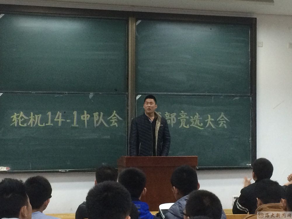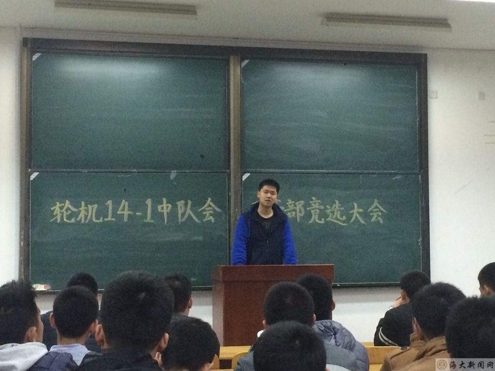 为了更好的发掘中队人才,公平、合理任用中队干部,健全中队管理体制,充分发挥中队干部作用,推动中队建设,3月22日晚,bat365在线中国官网登录入口轮机2014-1中队在远航楼101教室召开新学期第一次中队会及干部竞选大会,大会由副中队长李嘉源主持。