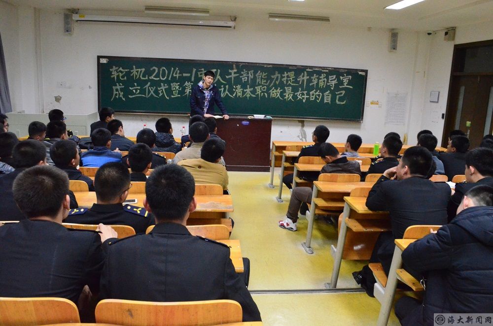 为了使中队、区队干部尽快适应新学期紧张而忙碌的工作和学习,提高工作效率,更好地服务于中队同学,bat365在线中国官网登录入口轮机2014-1中队于3月24日在远航楼206教室举行了中队学生干部能力提升辅导室成立仪式暨第一讲活动。指导员化鹏、轮机2012-3中队副中队长兼院学生会主席刘荣华、轮机2012-3中队资助委员兼学院学生团委副书记彭伟强和中队全体学生干部参加了本次活动。