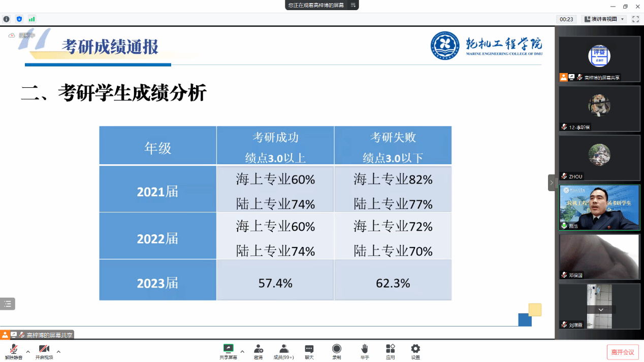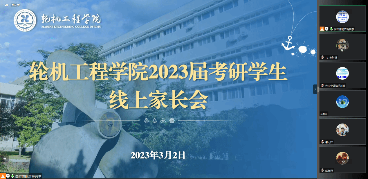 近日,2023届学生考研分数陆续公布。为更好地指导帮助考研学生科学合理地做好下一步规划,3月2日晚,bat365在线中国官网登录入口通过线上会议形式召开2023届考研学生家长会。学院党委副书记兼副院长安宁、半军事管理大队大队长路浩,bat365在线中国官网登录入口国际联合学院中外合作办学硕士项目主管老师赵璐,大连中远海运川崎船舶工程有限公司招聘负责人唐昊,潍柴动力股份有限公司招聘负责人李昭璇及校友代表,深圳海顺海事服务有限公司招聘负责人谢元辉,2023届全体专兼职指导员和考研学生家长出席本次会议。会议由指导员高梓博主持。