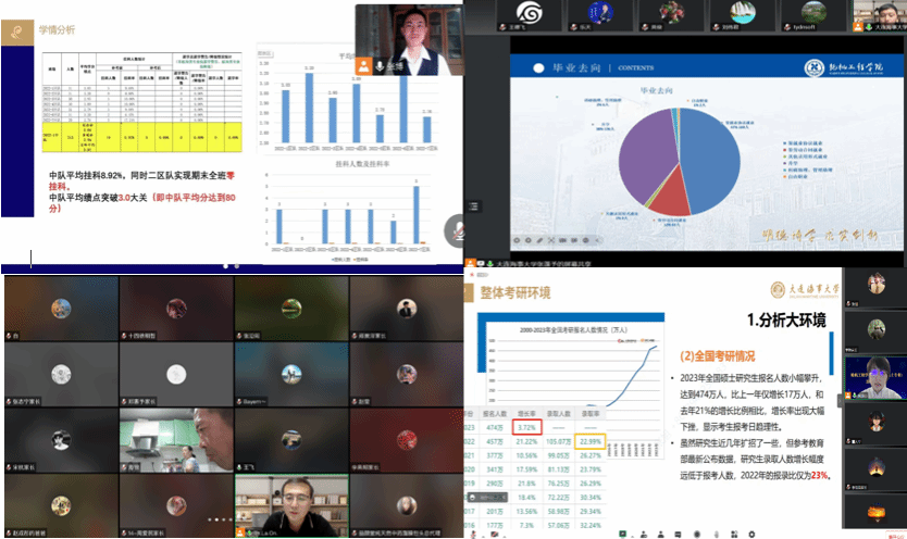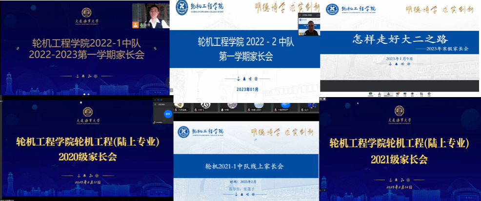 各中队围绕学情分析、学业指导、职业生涯规划和就业指导等方面进行通报及沟通交流。轮机2022-1中队指导员张博会前作了精心准备,通过可视化分析各科目挂科比例、平均绩点等数据,直观展现学生学习情况,详细介绍学校的学籍管理制度,对存在学业危机的同学进行预警,多维度展示学生在校学习情况。轮机2021-1中队指导员张蓬予分别从学情分析、就业去向、推免政策以及新学期安排四个方面为各位家长进行了讲解,并同各位家长展开交流和讨论,家长们积极互动,纷纷表示一定配合学校工作,家校合力做好学生教育培养工作。轮机2021-2中队指导员宋学明与全体学生家长相聚云端,以“怎样走好大二之路”切入,从思想引导、心理疏导、安全教育、学习指导、职业规划五方面进行深入交流,自由提问环节中,针对与会家长的困惑,指导员进行了耐心细致的解答。轮机2020-1中队指导员聂希达从就业方向、就业前景和近年保研情况等方面为家长介绍学院就业工作有关情况,并围绕就业误区与家长交流,呼吁家长要结合学生实际,合理引导,帮助学生选择适合自己的发展之路,引起家长们的普遍思考。轮陆2020中队指导员林润心向与会家长解读当前就业形势和政策,从考研的目的、考研的环境、报考院校专业、往届考研数据四个方面向家长们介绍了考研相关情况;同时重点对就业信息搜索、就业单位、待遇发展进行了解读,鼓励家长和学生们积极拓展就业渠道,做好就业规划。