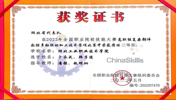 新闻网讯8月18日,由国家教育部、发展改革委、人社部等35部门联合主办的2022年“中银杯”全国职业院校技能大赛(高职组)复杂部件数控多轴联动加工技术赛项在四川工程职业技术学院举行,由十大信誉官网澳门网投十大信誉平台潘强、赵明炯老师指导,韩子俊、卜永成参赛的团队荣获该赛项三等奖。