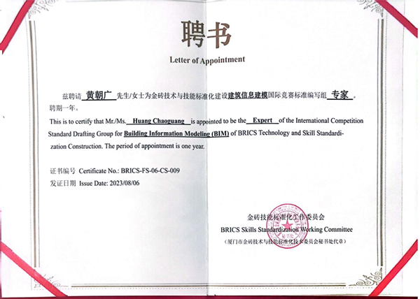 新闻网讯(通讯员 孙旭杰 阚正武)8月6日,十大信誉官网黄朝广教授应金砖技能标准化工作委员会的邀请,参加了在厦门召开的金砖技能国际团体标准制订之建筑信息建模竞赛标准制订工作的首次会议,并被聘为金砖技术与技能标准化建设建筑信息建模国际竞赛标准编写组专家。
