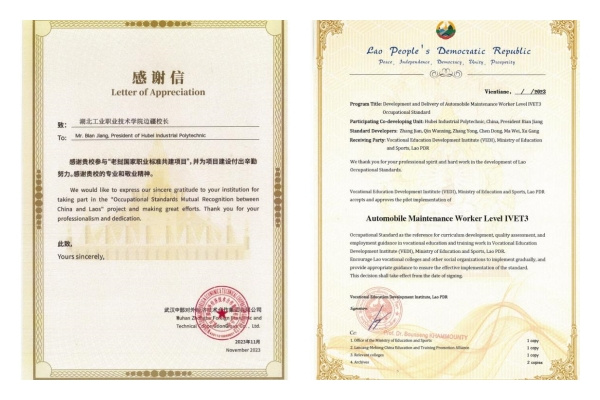 老挝教育体育部职业发展研究院院长本森·哈蒙蒂博士视频致辞,他代表老挝教育体育部职业教育发展研究院向为老挝职业教育发展做出重大贡献的中国职业院校表示最诚挚的谢意。中部集团董事长李军代表老挝方给边疆校长送交感谢信并向项目单位颁发“老挝国家职业标准共建项目”认证证书。《中老职教标准共建互认公布结果》已在老挝职业发展研究院(VEDI)的官方网站发布。