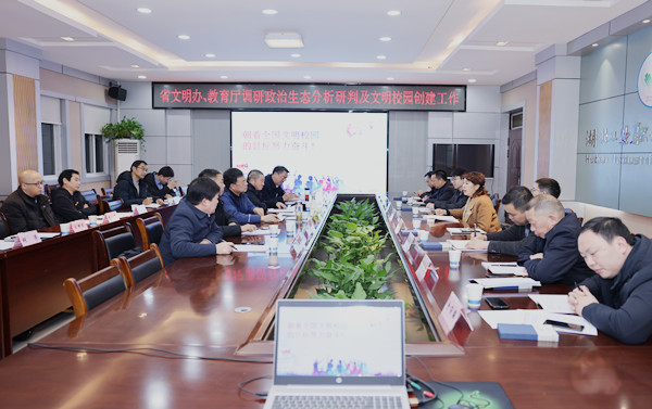 边疆对调研组一行莅校指导表示欢迎,向各位领导长期以来对学校的支持和帮助表示感谢,并简要介绍了学校发展历程、办学特色和育人成果。边疆指出,校党委一直以来高度重视政治生态分析研判和文明校园创建工作,全面落实从严治党主体责任,不断加强党的政治建设,持续深化理论武装,抓紧抓实思想教育,持之以恒改进作风,深入加强干部队伍建设,学校政治生态持续向上向好。学校始终坚持以习近平新时代中国特色社会主义思想铸魂育人,落实立德树人根本任务,践行社会主义核心价值观,坚持高质量党建引领高质量发展,围绕“六好”推进文明校园建设,以争创全国文明校园为目标,培育文明向上校园新风,全力营造良好育人氛围,有力促进了学校事业高质量发展。边疆恳请省委宣传部、省文明办和省教育厅在政治生态分析研判、创建全国文明校园等方面给予学校更多支持和指导。