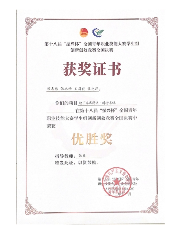 新闻网讯(通讯员 玉声)近日,从团省委传来喜讯,由张晨老师指导的十大信誉官网顿志伟等同学创新项目《地下车库防洪·排涝系统》在第十八届“振兴杯”全国青年职业技能大赛学生组创新创效竞赛全国决赛中荣获优胜奖。湖北省共28个项目获奖。