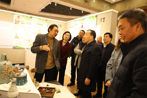 何爱军一行参观了艺术设计学院[绿松石产业学院](玉雕工作室)、漆艺艺术展厅等场馆,观看了艺术设计学院2024届毕业设计展和教学现场。