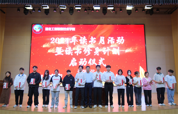学生代表上台宣读了活动倡议书,呼吁全体师生积极参与到读书活动中来,共同营造浓厚的阅读氛围。在热烈的掌声中,校长边疆宣布“湖北工业职院2024年读书节活动暨读书修身计划”正式启动,并向来自各二级学院的15名优秀学生代表赠书,鼓励同学们在阅读中汲取智慧,不断成长。