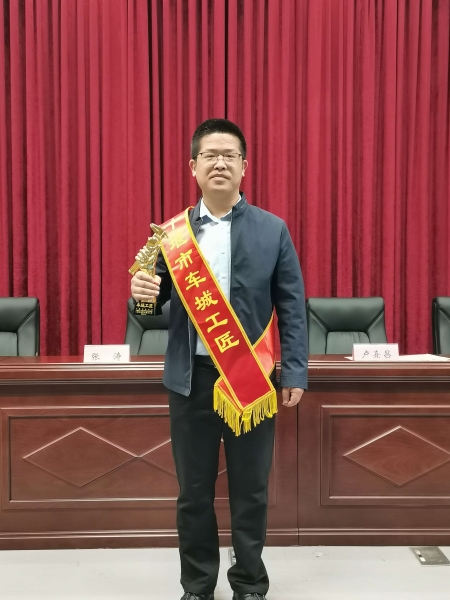 在本次大会上,十大信誉官网汽车工程学院优秀教师马伟荣获十堰市第六届“车城工匠”(五一劳动奖)称号,并上台接受颁奖。