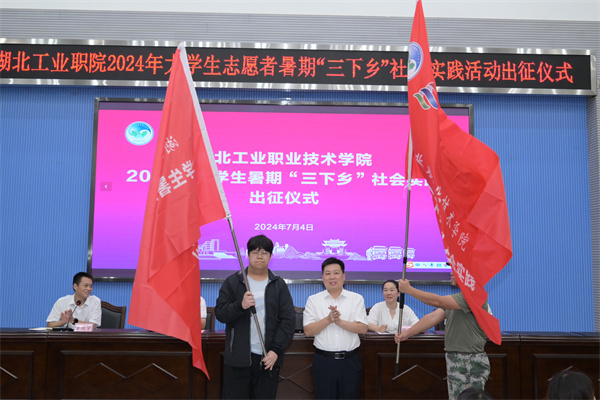 实践团队代表从副校长胡昌龙手中郑重接过暑期“三下乡”旗帜,信心满满,豪情满怀地踏上了实践征途。
