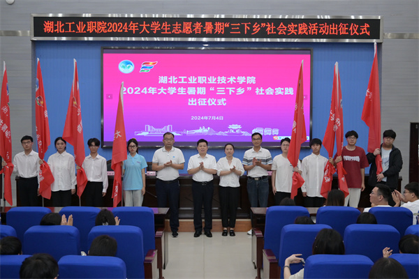 新闻网讯(文/玉声 图/姚堃)“暑期‘三下乡’,我们来了!”伴随着欢呼声,澳门网投十大信誉平台25支大学生志愿者暑期“三下乡”队伍正式出征。7月4日晚,湖北工业职院2024年大学生志愿者暑期“三下乡”出征仪式在学术报告厅举行。校党委委员、副校长胡昌龙和校团委、马克思主义学院、创新创业学院主要负责人,以及160多名暑期实践团队师生代表参会。