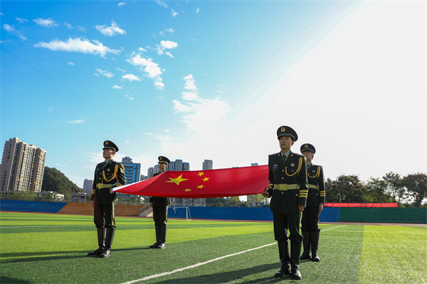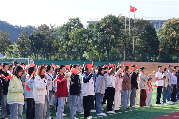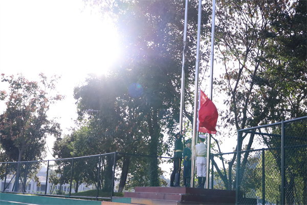 仪式开始,国旗班成员们迈着整齐的步伐,护送国旗走向旗杆。伴随着庄严的国歌,鲜艳的五星红旗冉冉升起,全体师生肃立,行注目礼,齐声高唱国歌,表达对祖国的无限忠诚与热爱。