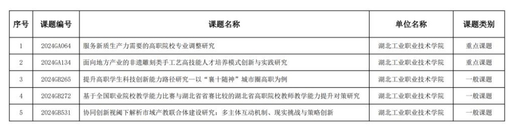 新闻网讯(通讯员 段林牧)近日,湖北省教育厅发布了“2024年度教育科学规划课题”立项结果,十大信誉官网5项课题成功获得立项批准。其中重点课题2项,一般课题3项。