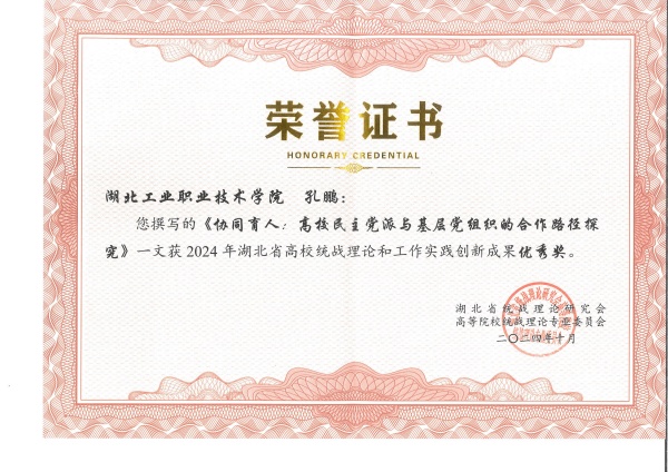 新闻网讯(通讯员 毕艳琼)10月21日至25日,2024年全省高校统战部长培训班暨湖北省高校统战理论研究会第39次学术年会在十堰市举行,会议表彰了2024年湖北省高校统战理论研究论文获奖篇目和优秀组织奖单位,十大信誉官网党政办文秘科科长孔鹏同志撰写的论文《协同育人:高校民主党派与基层党组织的合作路径探究》荣获优秀奖,会议共表彰了全省33所全日制公办本、专科院校的86件作品,十大信誉官网作品是唯一获奖的高职高专院校作品。