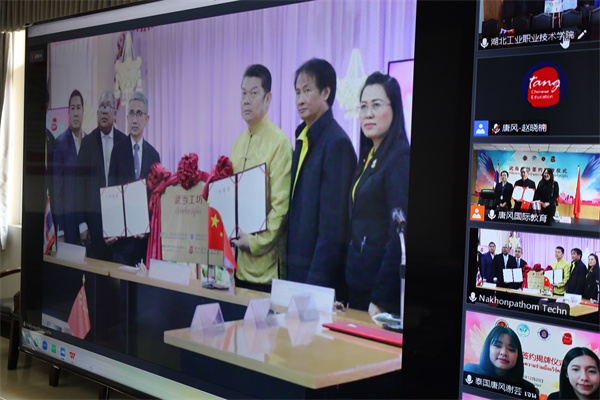 泰国佛统技术学院查那空森·孔园先生致辞,他表示,两校在智能制造领域具有广阔的合作前景,期待未来双方在师资培训、学生交换、合作办学、联合科研等方向开展更加频繁深入的交流合作,促进双方科技创新、卓越发展和文化互信。泰国中部四区职业教育中心副主任代理威拉·通帕拉西博士表示,此次合作将为泰国培养更多具有国际化视野和跨文化交流能力的技能人才,助力泰国经济社会发展。唐风国际教育集团总裁李劲松对此次线上签约和挂牌活动的成功举办表示祝贺,并对两国文化交流与合作表达美好期待和展望。